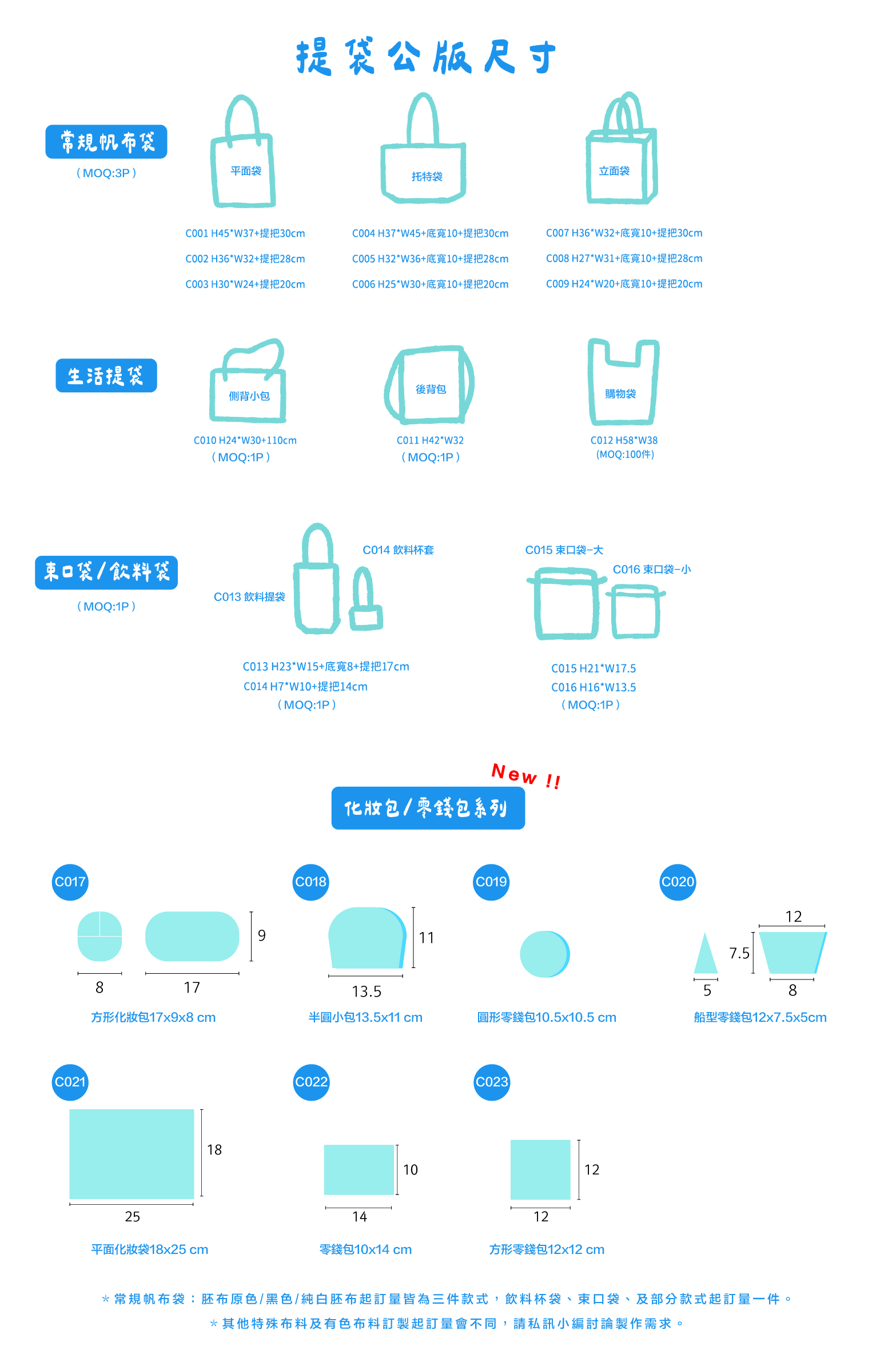 3.常規顏色為胚布原色/黑色,工廠皆有備有庫存布料,起訂量三件即可客製化印刷。